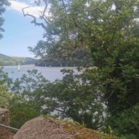 At this point the trail goes along the cliffs with beautiful views over the water. A bit further along you start to walk through the Sharp Tor. The views are amazing, and the path is right along the cliff edge. There were several boats out and about on the water with people water skiing.