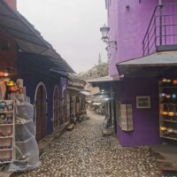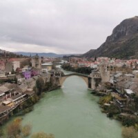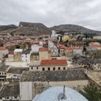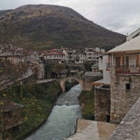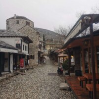 The rain was quite heavy during our drive, so we weren’t sure how much we would see of Mostar (or how much we would want to see walking in the cold rain). But as we arrived in Mostar, the rain started to soften, so we parked the car near the old bazaar and started to explore. We walked through the bazaar and over the old bridge. There wasn’t a whole lot open – a few stalls and a couple restaurants. Since it was still raining a little bit, we decided to find a restaurant in hopes that the rain would stop by the time we were done. We found a great restaurant (another one with a lovely, warm fire) and enjoyed a great meal.