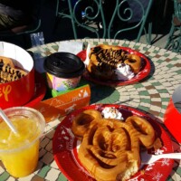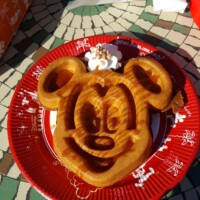 Once inside the park, we started the day with Mickey waffles! Yummy! What better way to start the day? Ben ordered the waffles while I secured a table. He came out with THREE waffles rather than two…he said it was a translation issue, but I think he just wanted an extra waffle! 🙂